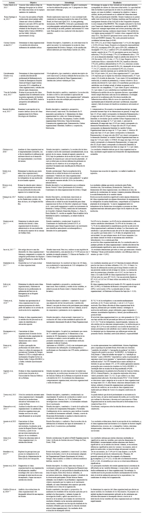 Resultados: dentro de los 26 artículos identificados, 24 fueron cuantitativos con diseños descriptivos transversales y correlacionales, uno mixto y uno cualitativo. Realizados en los países España, Brasil, Perú, Venezuela, México, Cuba, Chile, Colombia y Ecuador. De ellos 22 escritos en la lengua española, dos en lengua inglesa y dos en lengua portuguesa. Entre las revistas que más artículos aportaron se encuentran Ciencia y Trabajo y Revista Cubana de Salud Pública. Los instrumentos más utilizados fueron la escala y el índice de clima organizacional.