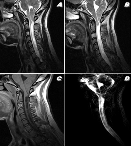 La RMN es la regla de oro para diagnosticar la siringohidromielia, que acompaña de un 34-40 % de pacientes con malformación de Chiari; esta se traduce como una colección linear y cilíndrica con intensidades similares a las del LCR de 2mm o más en la médula espinal, ya que las colecciones centrales menores de 2mm son consideradas como un canal central prominente.(11) El descenso de las amígdalas cerebelosas de 5mm o más por debajo del agujero occipital, acompañado o no de otras estructuras de la fosa posterior, en dependencia del grado de la malformación, denotan la presencia de malformación de Chiari. El desplazamiento de las amígdalas cerebelosas entre 3-5mm es considerado ectopia amigdalina; si es inferior a 3 mm se considera normal.(12)