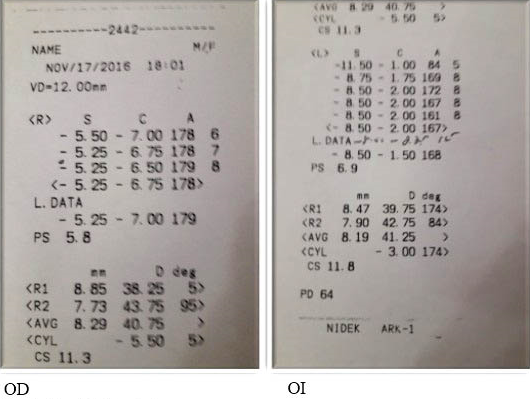 OI: 39,75 / 42, 75………D: -3,00 x 174 °.