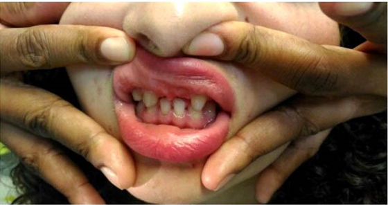 Alteraciones no oculares: dismorfismo craneofacial leve, hipertelorismo, hipoplasia maxilar con aplanamiento del tercio medio facial, frente prominente, y puente nasal ancho y aplastado. Las anomalías dentales incluyen microdontia o hipodontia. (Fig. 5y 6).