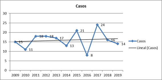 La distribución por años no mostró ningún hecho significativo a través del tiempo, solo una ligera tendencia al aumento, pero de forma general el comportamiento fue bastante regular. Se destacaron los años 2015 y 2017 por el mayor número de casos, y el año 2016 por la menor incidencia. (Gráfico 1).