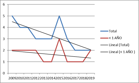 La mortalidad por sepsis en la UCI tuvo una lenta tendencia a disminuir desde el año 2009. Sin embargo, en el año 2015 hubo un pico de 5 casos que contrastó con lo que se venía viendo y con lo ocurrido en años posteriores. El número de fallecidos menores de un año fue similar al total, aunque con una tendencia más homogénea. Después del año 2015, se observó una disminución más sostenida del número de muertes. (Gráfico 2).