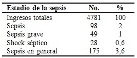 Del 1ro. de enero de 2009 hasta el 31 de diciembre de 2019, fueron admitidos en el Hospital Pediátrico Paquito González, un total de 4781 pacientes. De ellos, 175 presentó algún estadio de la sepsis, por lo que ingresaron en la UCI. El número de pacientes con sepsis fue 98 (2 %); con sepsis grave, 49 (1 %); y con shock séptico, 28 (0,6 %). En general, la sepsis tuvo una incidencia del 3,6 % con respecto al número de ingresos en la UCI. (Tabla 1).
