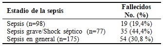 La mortalidad por sepsis como grupo único, incluyendo cualquier estadio, fue de 30,8 %. Sin embargo, 19 pacientes (19,4 %), de un total de 98, fallecieron a pesar de haber sido diagnosticados como sepsis no grave al ingreso. Por su parte, la mortalidad por sepsis grave/shock séptico fue del 45,5 %. (Tabla 2).