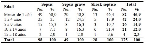 Methods: a descriptive, cross-sectional study was carried out at the Paquito González Cueto Pediatric Hospital in Cienfuegos. The clinical records of the children who, upon admission to the Intensive Care Unit, were diagnosed with sepsis, severe sepsis or septic shock were reviewed; between January 2009 and December 2019. A total of 175 patients met the inclusion criteria. The variables were: age, year, stage of sepsis, biological risk factors and mortality.