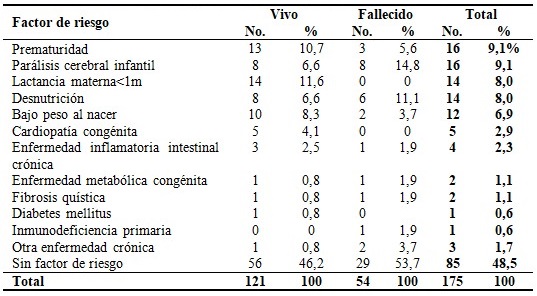 De los 54 fallecidos registrados, cerca de la mitad (53,7 %) no presentó antecedentes patológicos personales, pero el resto tuvo algún factor de riesgo de tipo biológico, entre los cuales se destacaron la parálisis cerebral infantil y la desnutrición, presentados en un 14,8 % y un 11,1 %, respectivamente. En los pacientes que sobrevivieron, los factores de riesgo más frecuentes fueron la ausencia de lactancia materna por más de un mes, la prematuridad y el bajo peso al nacer. (Tabla 4).