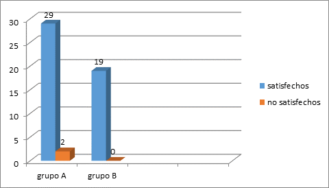 Los resultados satisfactorios reportados en la literatura oscilan en los 80 y 90 % de los pacientes operados, en el grupo A de nuestro estudio, el 96 % de los pacientes estuvo satisfecho con su cirugía y en el grupo B el 100 %.