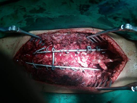 Se realiza un abordaje posterior de la columna vertebral, se esqueletizan apófisis espinosas, láminas, articulares y transversas a ambos lados, se liberan las partes blandas, para hacer más flexible la curva y lograr mayor corrección. Se colocan tornillos pediculares en la vértebra final inferior bilateral, en el lado cóncavo en la inmediata superior y en el lado convexo se deja una vértebra por medio. (Figura 1).
