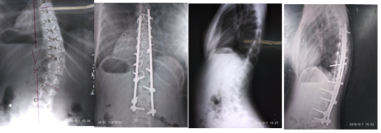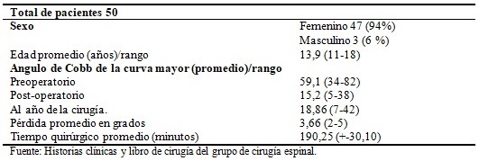 El ángulo promedio en el preoperatorio fue de 59,1 grados con un rango de 34 a 82, medido por el método de Cobb. En el posoperatorio inmediato el ángulo promedio fue de 15,2 grados con un promedio de corrección de 43,9 grados. Al año de la cirugía, el ángulo promedio fue de 18,86 grados con una pérdida de 3,66 grados como promedio. El tiempo quirúrgico fue de 190,25 minutos como promedio. (Tabla 4).