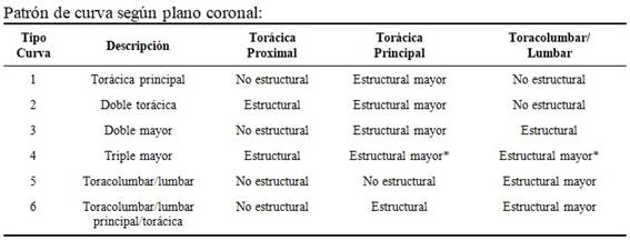 Del total de 50 pacientes el 60 %, es decir 30 pacientes, presentaron una curva tipo 1, de Lenke, curva torácica mayor, por mucho la más frecuente en nuestro estudio, seguido del tipo 5 con 10 pacientes (20 %). Estas son curvas simples. En menor frecuencia se presentaron las curvas tipo 3 y 6 que son dobles curvas estructurales. No se presentó en nuestra casuística ningún paciente con curvas tipo 2 y 4. (Tabla 5)