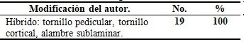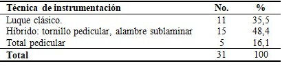 Methods: a case series intervention study was carried out with 50 patients operated on for scoliosis in adolescence, divided into two groups. Group A composed of 31 patients, operated on with three different instrumentation techniques and group B composed of 19 patients operated with a hybrid instrumentation technique, modified by the author, in the province of Cienfuegos, in the period between January of 2013 and December 2017.
