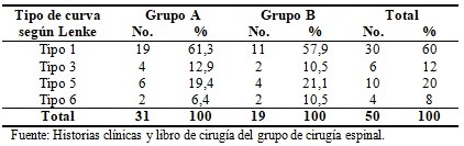 En ambos grupos predominó la curva torácica simple, es decir tipo 1 de Lenke con 19 y 11 respectivamente en los grupos A y B. (Tabla 5).