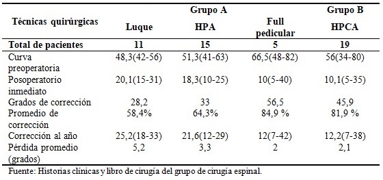 Resultados: el 96 % de los pacientes fue del sexo femenino, la edad promedio fue de 14 años. En el grupo A, los mejores resultados se lograron con la fijación total pedicular con 89,4 % de corrección posquirúrgica; con la técnica modificada por el autor se logró un 81,9 %, con mínimas complicaciones. La satisfacción de los pacientes fue de un 96 % en el grupo A y en los pacientes en los cuales se utilizó la modificación del autor, la satisfacción fue del 100 %.