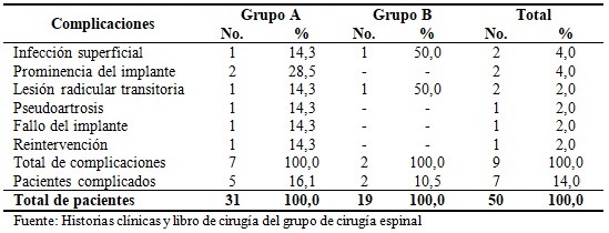 En el posoperatorio se presentó un total de 9 complicaciones en 7 pacientes, que representaron el 14,0 % del total de pacientes. Cinco de estas complicaciones se presentaron en el grupo A y dos en el grupo B. Dos pacientes presentaron infección superficial de la herida quirúrgica, que fueron solucionadas sin contratiempos; una en cada grupo. Prominencia del implante en dos pacientes que no tuvieron repercusión, dos paciente sufrieron una lesión radicular producida por el tornillo pedicular una en cada grupo. (Tabla 7)