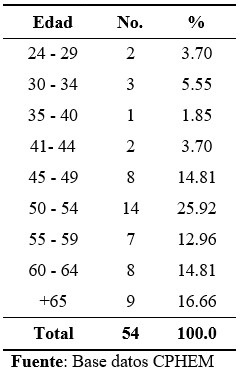 Al observar la tabla que muestra la distribución de los pacientes por grupos de edad, se observa un predominio de los mayores de 45 años, donde el grupo de 50 a 54 años predominó con un 25.92%, seguido del grupo de más de 65 años con un 16.66%. (Tabla 1).