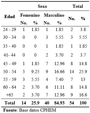 En cuanto a la relación entre edad y sexo se observa un predominio de pacientes masculinos (84.93%), comprendidos entre las edades de 50 y 54 años para un 16.66%. Las féminas están igualmente más representadas entre las edades de 50 a 54 (9.25%). (Tabla 2).