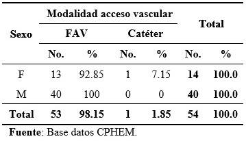 La mayoría de los integrantes de la serie dispusieron del acceso vascular por medio de la fístula arterio-venosa, que constituye la vía idónea para su conexión a la máquina de hemodiálisis, y solo una reducida cifra de afectados recibieron la hemodiálisis con catéter según el estudio de Díaz Mederos,4) lo cual no difiere de los hallazgos de esta investigación.