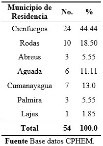 El municipio Cienfuegos aporta el mayor número de pacientes representando un 44.44% seguido del municipio Rodas con un 18.5%. El municipio Cruces no reporta pacientes con Hepatitis C. (Tabla 4).