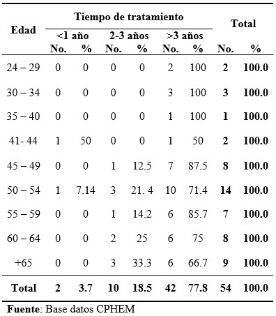 En relación al tiempo de tratamiento de los pacientes en el Servicio de Hemodiálisis según edad, se observa que el tiempo de tratamiento que predominó fue de más de 3 años para un 77.8%, Sobresalió en este grupo las edades entre 24 a 40 años con un 100% de los pacientes, seguido de los casos de 45 a 49 años (87.5%). El tiempo de tratamiento de 1 año o menos es el que menos prevaleció (3.7%). (Tabla 5).