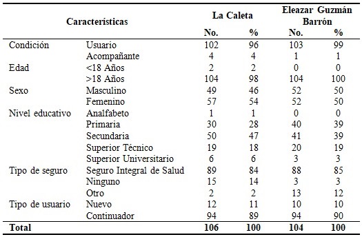 De los 106 pacientes del hospital La Caleta (HLC), 96 % fueron usuarios, 98 % mayores de edad, 54 % mujeres, 47 % del nivel secundario, 84 % afiliados al Sistema Integral de Salud (SIS), y 89 % continuadores; para el hospital Eleazar Guzmán Barrón (HEGB) se tuvo una muestra de 104 pacientes, de los cuales, 99 % fueron usuarios, 100 % mayores de edad, con similar porcentaje para ambos sexos. Asimismo, predominaron los niveles primario y secundario con 39 % cada uno, 85 % fueron afiliados al SIS y 90 % fueron continuadores. (Tabla 1).