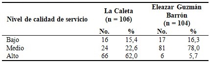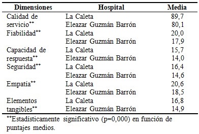 Results: the level of quality was high (62%) and medium (78%) for the La Caleta and Eleazar Guzmán Barrón hospitals, respectively. There was a difference in the quality of the service, represented by the dimensions of reliability, responsiveness, security, empathy and tangible elements. In the correlation analysis, only in the Eleazar Guzmán Barrón Hospital was a significant and positive association found between the type of user and the quality of service.