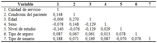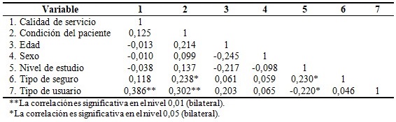 Existió asociación positiva entre la calidad de servicio y los factores condición del paciente (0,148), tipo de seguro (0,087) y tipo de usuario (0,188); mientras que los factores edad (-0,006), sexo (-0,078) y nivel de estudio (-0,140) expresaron asociación negativa, y para todos los casos fueron estadísticamente no significativos. (Tabla 4)