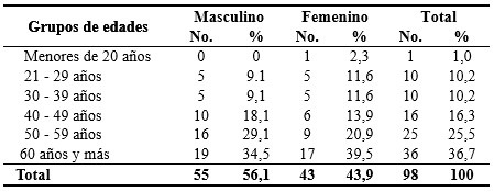 Del total de 98 pacientes predominó el grupo de 60 años y más con 36(36,7%), fundamentalmente del sexo masculino con 19 (34,5%), seguido del de 50 a 59 años (25,5%). Según el sexo hubo un predominio del masculino representado por el 56,1 %. Solo se reportó un caso con menos de 20 años. (Tabla 1).