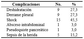De la totalidad de los pacientes estudiados 33 presentaron alguna complicación, predominando el shock en casi la mitad (45,5 %). La deshidratación y el derrame pleural aportaron la misma cantidad de pacientes para un 54,6 % de las complicaciones. (Tabla 10).