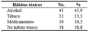 El hábito tóxico más frecuentemente declarado fue el consumo de alcohol, presente en 45 pacientes (45,9%), seguido de los pacientes sin hábito tóxico, con 38 (38,8%). (Tabla 2).