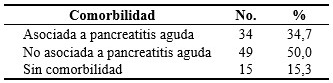 En el período de la investigación, 49 pacientes (50,0 %) de los ingresados con el diagnóstico de pancreatitis aguda presentaban comorbilidad no asociada a la enfermedad. La hipertensión arterial fue la no asociada más frecuentemente observada. Entre los enfermos con afección asociada a la entidad se encontraron 34 casos (34,7 %), la litiasis biliar fue el principal factor etiológico, seguido por obesidad e hiperlipidemias. (Tabla 3).
