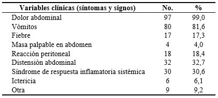 El dolor abdominal y los vómitos como variables clínicas estuvieron presentes en la mayoría de los pacientes estudiados con un porcentaje individual de 99,0 %, en 97 pacientes y 81,6 % en otros 80, respectivamente. Los signos evidentes fueron la distensión abdominal en 32 (32,7 %) y el síndrome de respuesta inflamatoria sistémica en 30 pacientes para un (30,6 %). (Tabla 4).