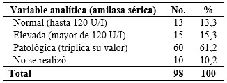 En el período estudiado se realizó, en el momento del ingreso, amilasa sérica a 88 pacientes, en 60 de ellos se encontró triplicado su valor para un 61,2 %. El valor elevado se encontró en 15 (15,3 %) y en solo 10 pacientes no se realizó el estudio por la falta de disponibilidad en el centro. (Tabla 5).