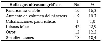 A todos los pacientes ingresados con diagnóstico de pancreatitis aguda se le realizó la ecografía abdominal en el momento del ingreso, siendo el hallazgo más relevante la litiasis biliar en 42 enfermos para un 42,9 %, seguido por un aumento del volumen del páncreas en 19 que representa el 19,7 %. En 18 pacientes (18,4 %), no se presentaron alteraciones. (Tabla 6).