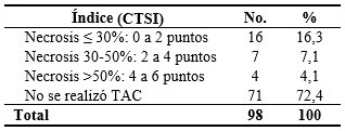 Del total de los pacientes ingresados a solo 27 pacientes (27,6 %) se le realizó tomografía computarizada permitiendo el cálculo del índice de severidad. En 16 pacientes dicho score correspondió a una necrosis equivalente a menos de un 30 %, para un 16,3 %. En 71 pacientes se difirió el estudio en correspondencia con la mayoría de casos leves valorados. (Tabla 7).