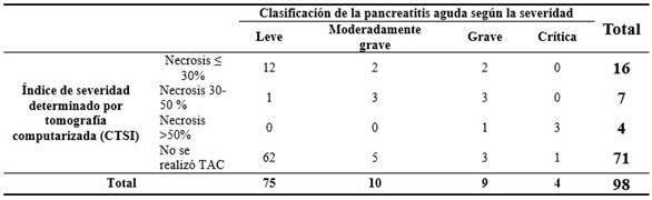 Al relacionar el índice de severidad por TAC y la clasificación de la pancreatitis aguda según la severidad se demostró que de los 71 pacientes donde no se le realizó el score 62 fueron casos leves y el resto mostró alteraciones graves de la enfermedad que fueron diagnosticadas por laparotomía y/o el fallo orgánico transitorio o persistente. En los 16 casos donde el estudio reportó una necrosis menor de un 30 %, tuvo relación en 12 pacientes, para una eficacia de un 75 %. Solamente en 1 enfermo de los 7, donde la necrosis se extendió entre un 30-50 %, no se demostró relación y en los 4 casos más graves, el estudio reportó una eficacia de un 100 %. La eficacia del score en todos los casos fue de 81,4 %). De modo general la necrosis menor del 30 % predominó al obtenerse en 16 pacientes de los 27 a los que se le realizó el estudio.