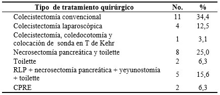 El procedimiento quirúrgico más empleado en los 32 casos fue la colecistectomía convencional, representada por 11 pacientes (34,4 %), seguido por la necrosectomía pancreática y toilette en 8 para un 25,0 %. El régimen de relaparotomía programada + necrosectomía pancreática + yeyunostomía + toilette se realizó en los 5 individuos con diagnóstico de severidad grave y crítico (15,6 %). El resto de los tratamientos representó el 28,1 %. (Tabla 9).