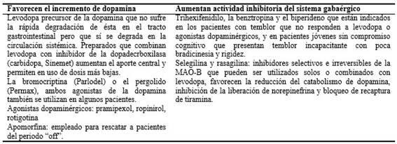 Su tratamiento va dirigido fundamentalmente a controlar los síntomas. Se aplican diferentes estrategias en el uso de fármacos por influir diferentes factores como la dependencia de la edad, tiempo del padecimiento de la enfermedad, grado de tolerancia de los efectos de los fármacos.