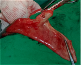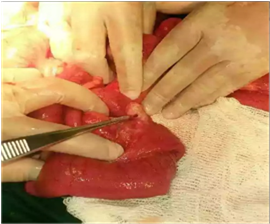 Se realiza laparotomía exploradora y se revisa estómago y primera y segunda porción del duodeno sin encontrar indicio de perforación. Se revisa el resto de la cavidad encontrando a 60 cm de la válvula ilio-cecal divertículo de Meckel perforado (Fig 2).