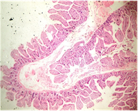 No se aprecia gran peritonitis, escaso líquido en fondo del saco de Douglas, se lava y seca cavidad y se procede a realizar recesión de ilion con divertículo incluido (Fig. 3) y anastomosis, término terminal en dos planos. Se recibe biopsia de la pieza quirúrgica: la cual informa descripción macroscópica y diagnóstico histológico consistente con divertículo de Meckel sin presencia de tejido ectópico (Fig. 4).