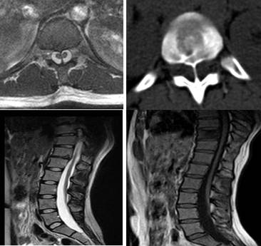 Fig. 1. Imágenes de resonancia magnética y tomografía de columna dorso lumbar en las que se observa la presencia de diastematomielia tipo I y médula anclada.