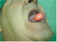 En el examen clínico de la cavidad oral, se observó paciente parcialmente desdentado con rehabilitación protésica desajustada, además se halló la lesión en la región lateral y dorso de la lengua de aproximadamente 2 cm de diámetro y color amarillento. Al tacto se notaba bien circunscrita con tendencia de fijación a plano muscular superficial de la lengua. (Fig.1).