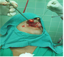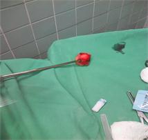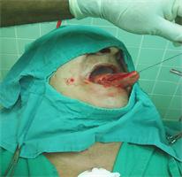 Por su localización, y por la incontrolada constancia de su movimiento en algunos pacientes es necesaria la tracción lingual, en el momento de la cirugía. Con el paciente se realiza este procedimiento con hilo de sutura catgut cromado 3-0, previa anestesia local infiltrativa con mepivacaína al 3% sin vasoconstrictor. Esto se debe a la fuerte capitalización de la zona con el plexo arteria sublingual y venas raninas, utilizando solamente un carpule de la misma, teniendo en cuenta los antecedentes patológicos del paciente. (Fig.3). Se procedió de esta manera a la tracción, método muy eficaz en este caso ante la imposibilidad de hacerlo digitalmente con gasa. (Fig. 4).