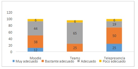 La modalidad de telepresencia fue la que más criterios de dominio “muy adecuado” concentró. Para facilitar el aprendizaje a distancia cobran especial relevancia todas las plataformas de aprendizaje en línea, las educativas abiertas, las aplicaciones multiplataforma, los dispositivos móviles, el ‘campus virtual’, y en general, todas las alternativas tecnológicas a distancia o en línea, que permitan lograr el objetivo de avanzar en los espacios educativos, el trabajo o cualquier otra actividad;4 de manera que esta herramienta, que también garantiza el distanciamiento social, tuvo mejor aceptación con respecto al resto. Por otra parte el uso y efectos de las plataformas Moodle son más tangibles, toda vez que permiten a los profesores articular sus cursos (incluidas tareas docentes y actividades evaluativas) y ponerlos a disposición de los educandos de manera rápida y eficaz. De hecho, es la plataforma más utilizada actualmente por las universidades de todo el mundo. A pesar de ello, solo el 12 % de los profesores manifestó plena capacidad respecto a su uso.