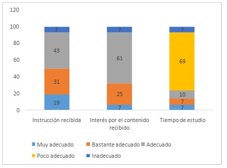 Sobre la percepción del proceso de adquisición de habilidades, destacó que el 69 % de ellos consideró “poco adecuado” el tiempo de estudio; y que el 61 % expresó, también como “adecuado”, el interés por el contenido. (Fig. 2).