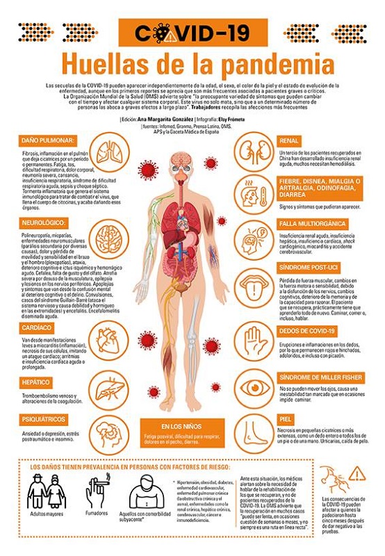 Una vez transcurrido ya un año del inicio de la pandemia del nuevo coronavirus SARS-CoV-2, la mirada se ha vuelto a esta etapa evolutiva de los enfermos, así como a la identificación y seguimiento de las posibles consecuencias -temporales o permanentes- de esta infección sistémica, por lo demás hasta ahora desconocidas. El National Health System Inglés estimó recientemente que el 45 % de pacientes hospitalizados en ese país necesitaron asistencia después de egresados y el UK Covid Symptom Study encontró que un número significativo de personas reportaron síntomas al mes y entre un 10 % y un 20 % refirieron complicaciones por tiempos más largos.9,10)