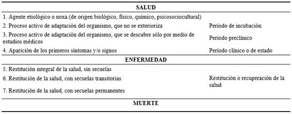 En la que se conoce como “historia natural de la enfermedad”, la recuperación de la salud es la última etapa. [ ] El denominado período clínico puede revertirse con una curación completa o restitución total al estado de salud que la persona tenía anteriormente(restitutio ad integrum se decía tradicionalmente cuando desaparecían completamente tanto las alteraciones morfológicas como funcionales ocasionadas por la enfermedad). Pero esto no siempre se logra. A las pérdidas o alteraciones, que perduran después de que el individuo ha rebasado el período clínico de la enfermedad -siempre que la gravedad de esta no haya llevado al paciente a la muerte-, se les denomina secuelas. (Tabla 1). [b]