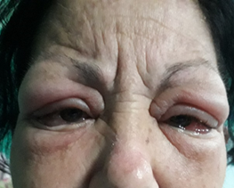 La paciente se ingresó con el diagnóstico de sospecha de una celulitis orbitaria o linfoma orbitario dado por la bilateralidad del cuadro y los antecedentes patológicos personales de una artritis reumatoidea. No refirió fiebre ni otras manifestaciones sistémicas.