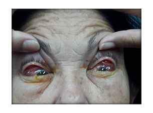 A: edema palpebral sin signos inflamatorios evidentes, quemosis conjuntival importante que abarcaba toda la conjuntiva bulbar externa e inferior, con vasos conjuntivales dilatados, ingurgitados, sobre todo a nivel de la conjuntiva bulbar superior; masa tumoral palpable a nivel del cuadrante supero-externo de la órbita en el ojo derecho y más localizado hacia el sector medio y externo del ojo izquierdo algo duro al tacto, no fluctuante y proptosis del globo ocular de predominio axial. (Fig. 1 y Fig.2).