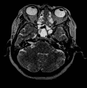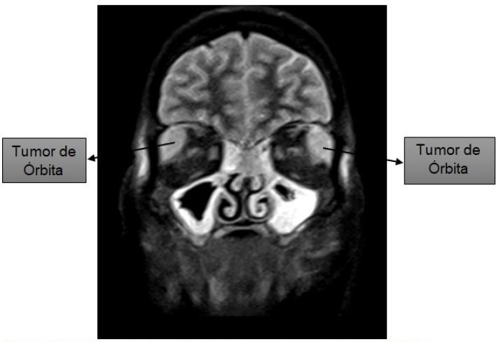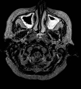 Resonancia magnética nuclear: se realizó estudio endovenoso con múltiples secuencias y arrojó: senos perinasales parcialmente ocupados, no se observan alteraciones de los globos oculares, de los músculos ni del nervio óptico. En ambas órbitas en el espacio extraconal se observa una imagen alargada con crecimiento supero-anterior que bordea al globo ocular por su parte antero-externa y desplaza al músculo recto externo medial y caudalmente, dicha imagen se comporta hipointensa en T1 e hiperintensa en el resto de las secuencias y aumenta su intensidad de forma homogénea con el contraste endovenoso en relación con un proceso inflamatorio de la órbita. (Estas lesiones son sugestivas de una celulitis orbitaria + pansinusopatìa). (Fig. 4, Fig.5 y Fig.6).