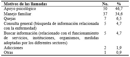 Methods: a descriptive study was carried out of the telephone counseling service aimed at the population with psychological disorders, carried out by the Mella District Mental Health Center, Camagüey province, during May 2020. The reasons for the call, clinical manifestations and behavior to follow were the main variables studied.